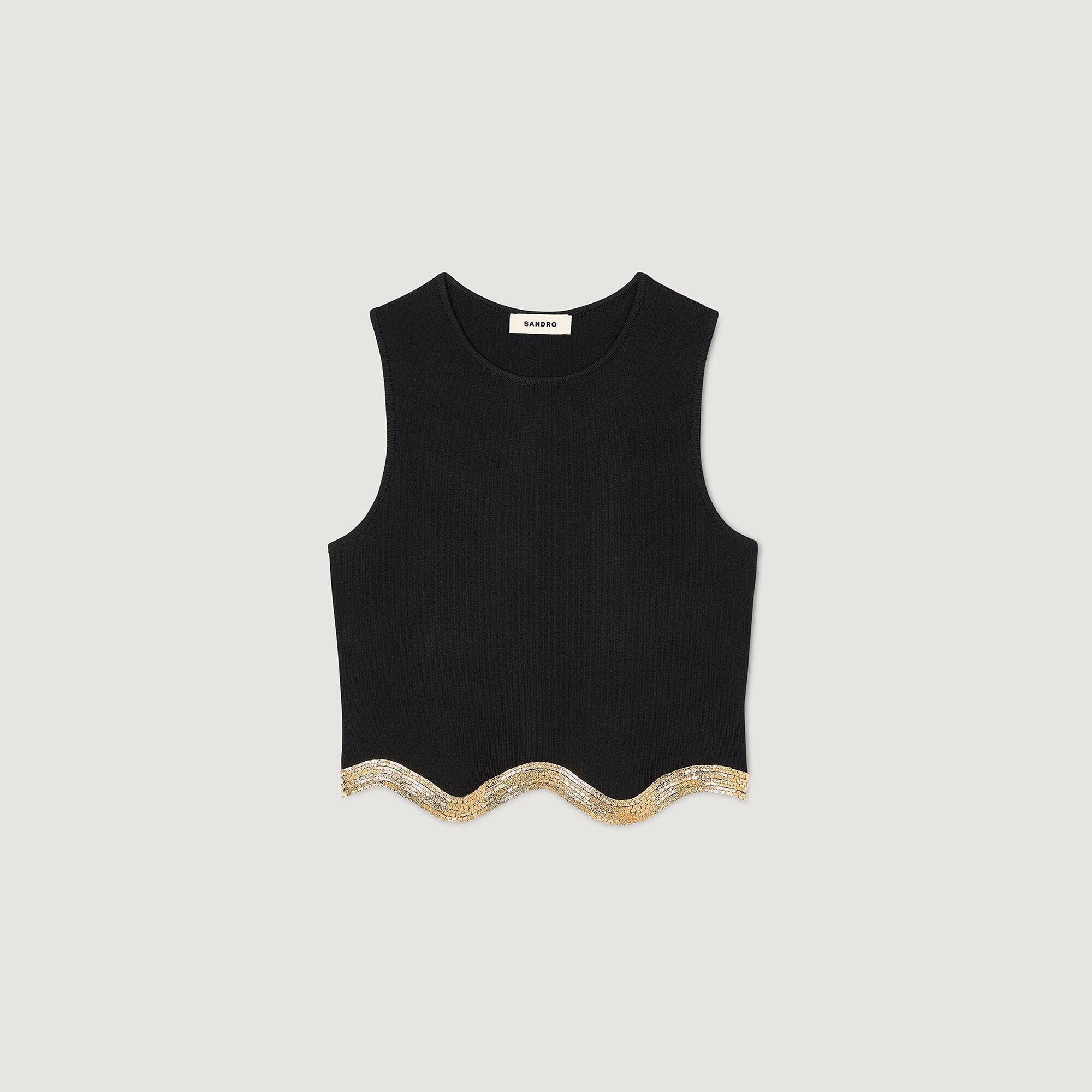 كنزة قصيرة الأكمام مزينة بحواف معدنية على شكل موجات في الأسفل